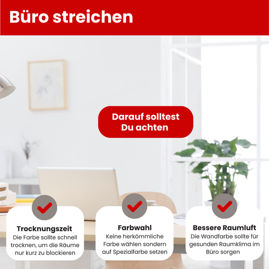Mit der richtigen Farbe sorgst du für ein angenehmes Raumklima, das motiviert und die Konzentration steigert. Eine Farbe, die schnell trocknet, angenehm riecht und gut deckt, sorgt dafür, dass du keine Zeit verlierst und dein Büro schnell wieder einsatzbereit ist.