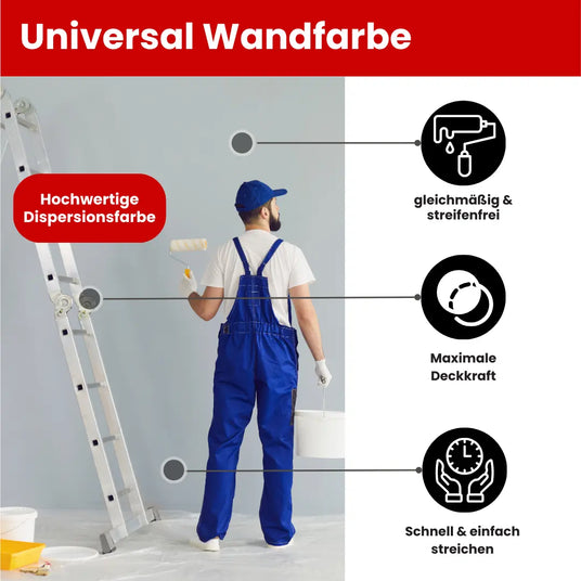 Die Dispersionsfarbe ist die perfekte Wahl für saubere, gleichmäßige Anstriche in allen Innenräumen. Mit hoher Deckkraft und einfacher Verarbeitung sorgt sie für ein streifenfreies, professionelles Finish auf Wänden und Decken. Diese vielseitige Farbe ist strapazierfähig, pflegeleicht und sowohl für Wohnräume als auch für stark beanspruchte Bereiche wie Flure oder Treppenhäuser ideal geeignet.