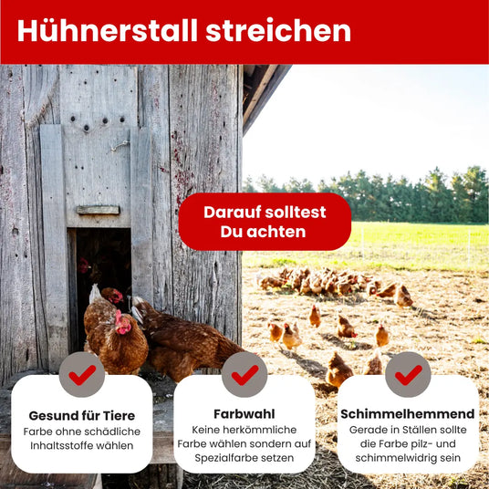 Mit unserer Hühnerstallfarbe schaffst du eine gesunde Umgebung für deine Hühner. Die atmungsaktive und umweltfreundliche Farbe schützt die Stallwände vor Feuchtigkeit und Schädlingen. So bleibt der Stall langlebig und bietet den Tieren einen sicheren Rückzugsort.