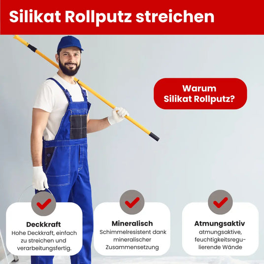 Mit Silikat Rollputz sorgst du für atmungsaktive, robuste und dekorative Wände. Schütze deine Räume vor Feuchtigkeit und Schimmel, während du gleichzeitig eine attraktive, strukturierte Oberfläche schaffst.