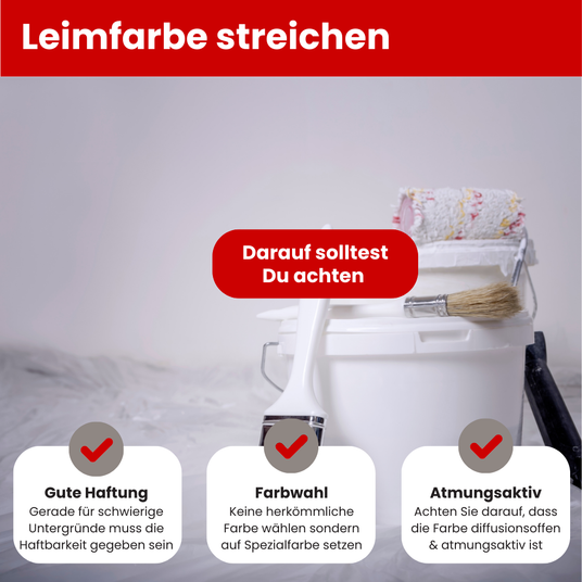 Mit Leimfarbe erhältst du nicht nur eine atmungsaktive Wandbeschichtung, sondern auch eine natürliche, matte Optik, die besonders in Altbauten und denkmalgeschützten Häusern beliebt ist. Sie sorgt für ein angenehmes Raumklima und lässt sich bei Bedarf leicht abwaschen. Ideal für Räume, in denen Natürlichkeit und Atmungsaktivität im Vordergrund stehen.