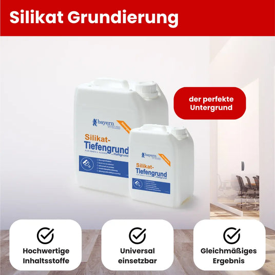 Silikat Grundierung ist eine spezielle Grundierung auf mineralischer Basis, die für den Einsatz auf mineralischen Untergründen wie Putz, Beton, Ziegel oder Kalksandstein entwickelt wurde. Sie dringt tief in den Untergrund ein, reduziert die Saugfähigkeit und schafft eine homogene Oberfläche, die die Haftung von Silikatfarben verbessert. Silikat Grundierung ist besonders wichtig, wenn du eine langlebige und wetterbeständige Beschichtung erzielen möchtest, da sie den Untergrund stabilisiert und vor Abblättern oder Rissen schützt.